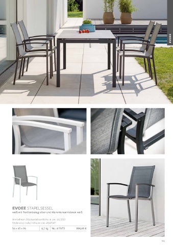 EVOEE EVOEE STAPELSESSEL weiß mit Textilenbezug silber und Aluminiumarmlehnen weiß Armlehnen-/Rückenlehnenhöhe in cm: 66,5/50 Sitzbreite/-tiefe/-höhe in cm: 43/47/47 56 x 65 x 96 4,2 kg No. 417673 184,03 € 143