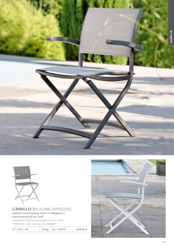 CAMILLO CAMILLO BALKONKLAPPSESSEL weiß mit Textilenbezug silber und klappbaren Aluminiumarmlehnen weiß Armlehnen-/Rückenlehnenhöhe in cm: 69/45 Sitzbreite/-tiefe/-höhe in cm: 44/44/47 57 x 58,5 x 89 5,8 kg No. 416879 209,24 € 169